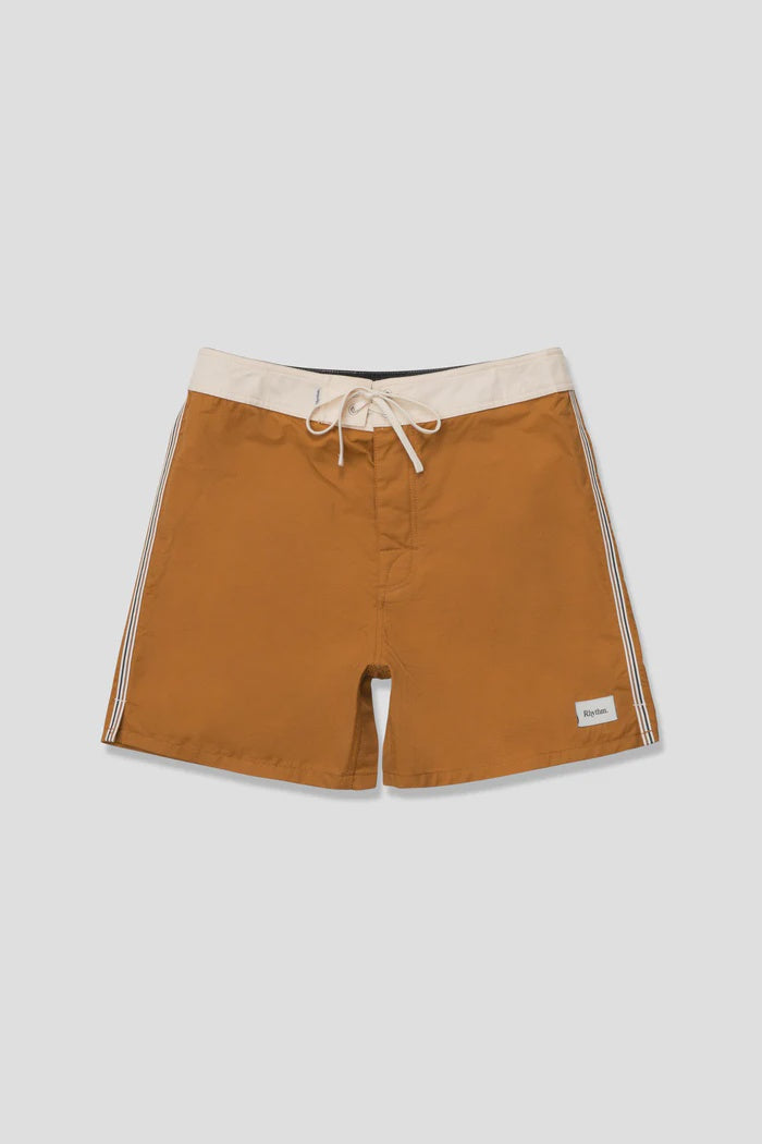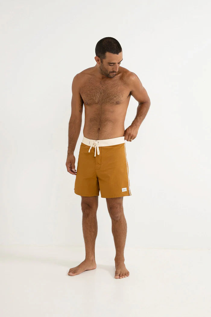 A timeless boardshort built for durability, the Heritage Trunk in Dijon features a high-waisted cut with a secure fit. A single waistband tab, flat lace drawstring, and triple-needle reinforced seams ensure strength, while a button-flap back pocket adds functional detail.