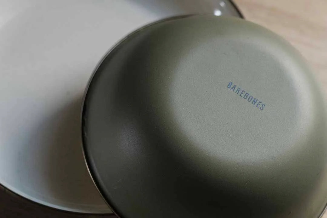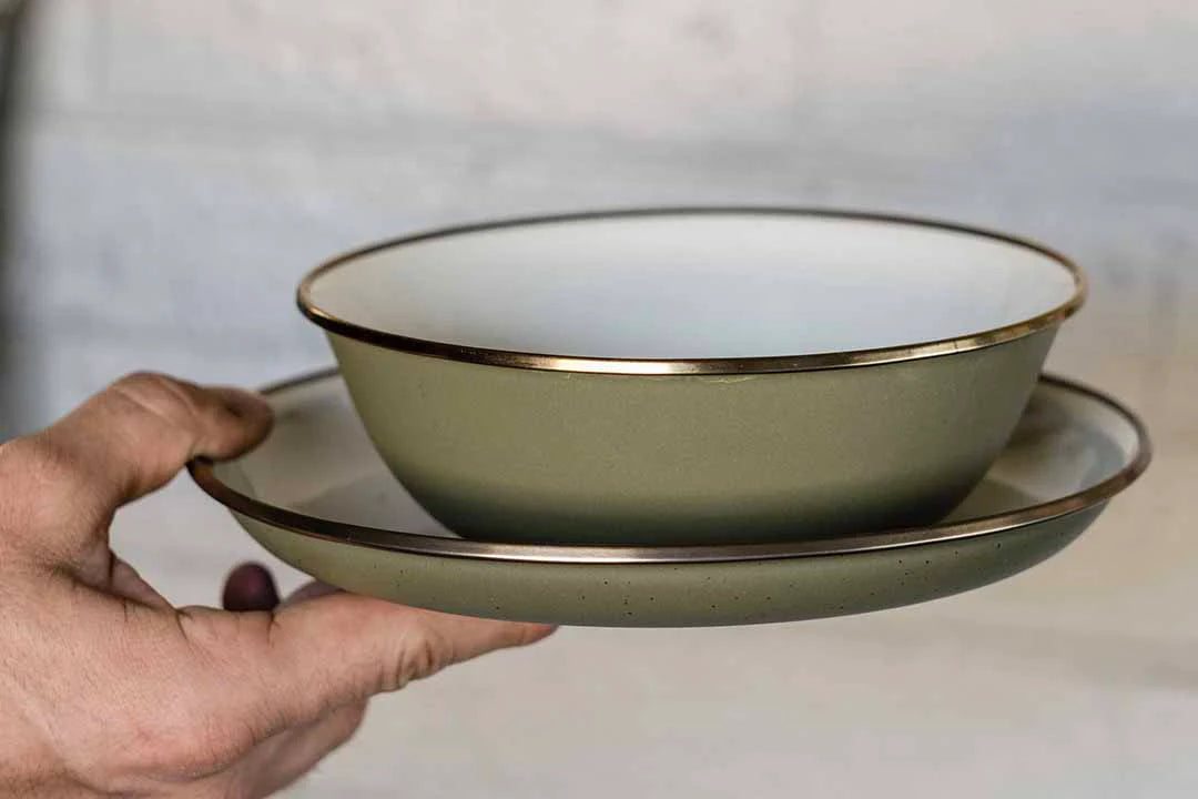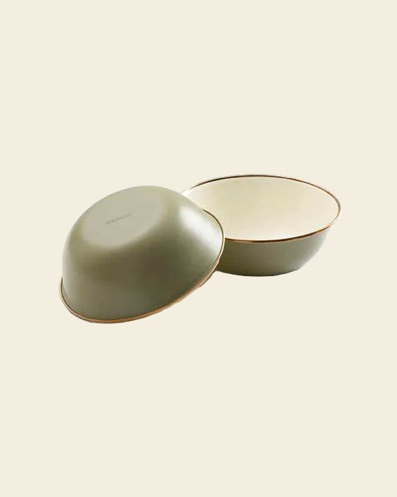 Our two-tone enamelware is crafted with a solid steel core and a rust-resistant heated glass exterior, producing a study and sleek piece. The interior is a smooth and speckled enamelled white, while the exterior boasts a sophisticated matte olive drab colour, complete with our signature bronze-like stainless steel rim. In addition to retaining the characteristics of traditional enamelware, the smooth interior also guards against food stains, while the textured exterior provides superior grip and resilience.