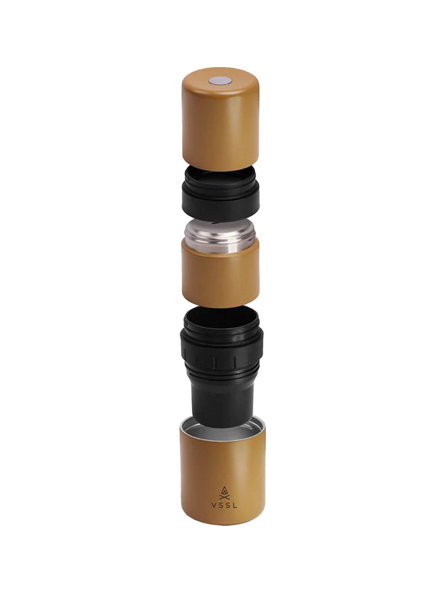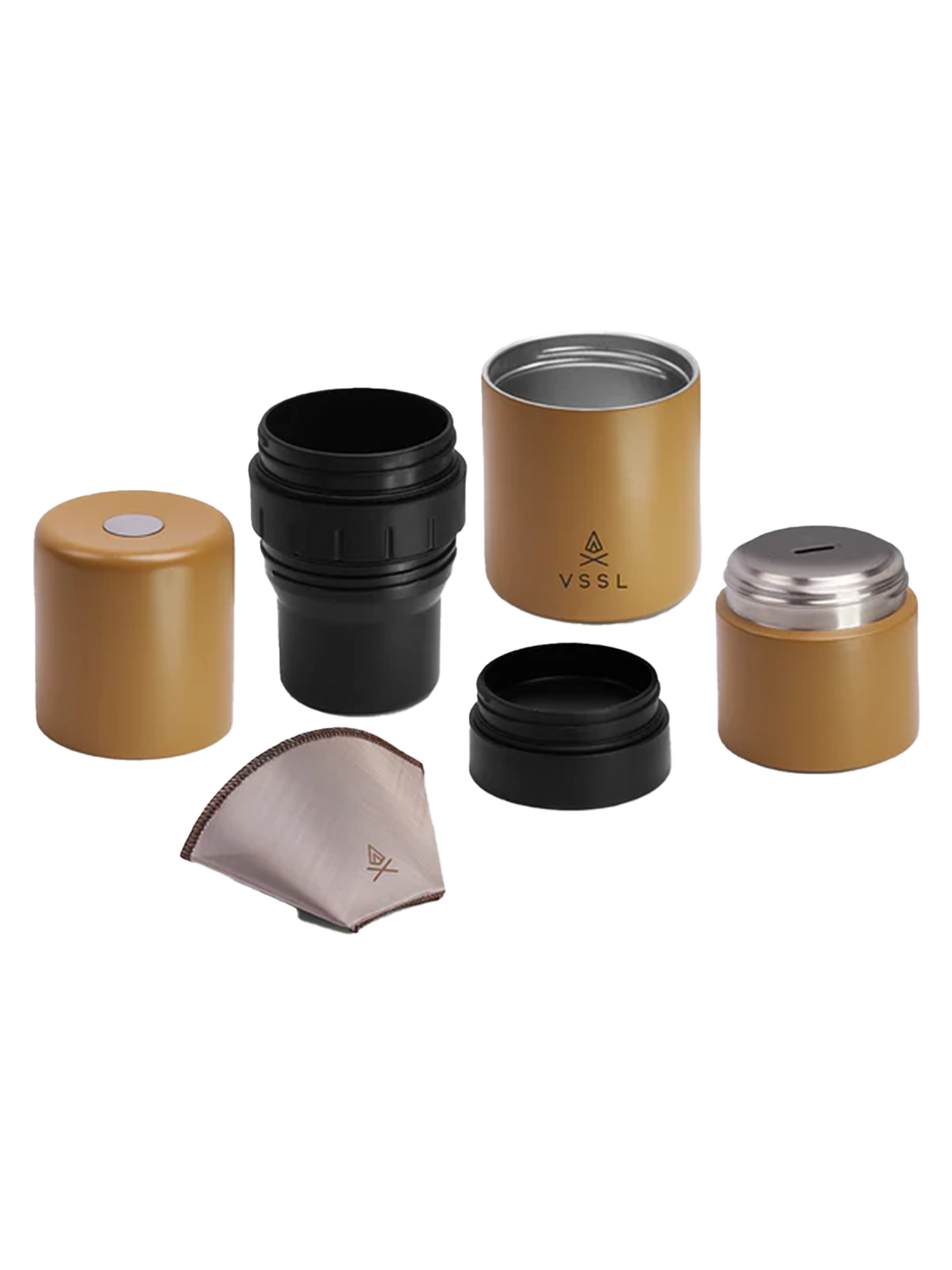 The Nest Pour Over Kit incorporates double walled stainless-steel construction with a BPA Free lid and storage connector into a rugged, portable pour-over coffee brewing system. Dual threads enable the 5-piece kit to assemble into one compact unit perfect for travel, overlanding and other outdoor endeavors. When disassembled, the Kit delivers two 10oz mugs, one splash proof lid, a pour-over dripper, and a nesting storage connector that allows the system to be compatible with the Java G25 Grinder (not included). This holistic coffee brewing system delivers a premium brewing experience. Anywhere. Everywhere.