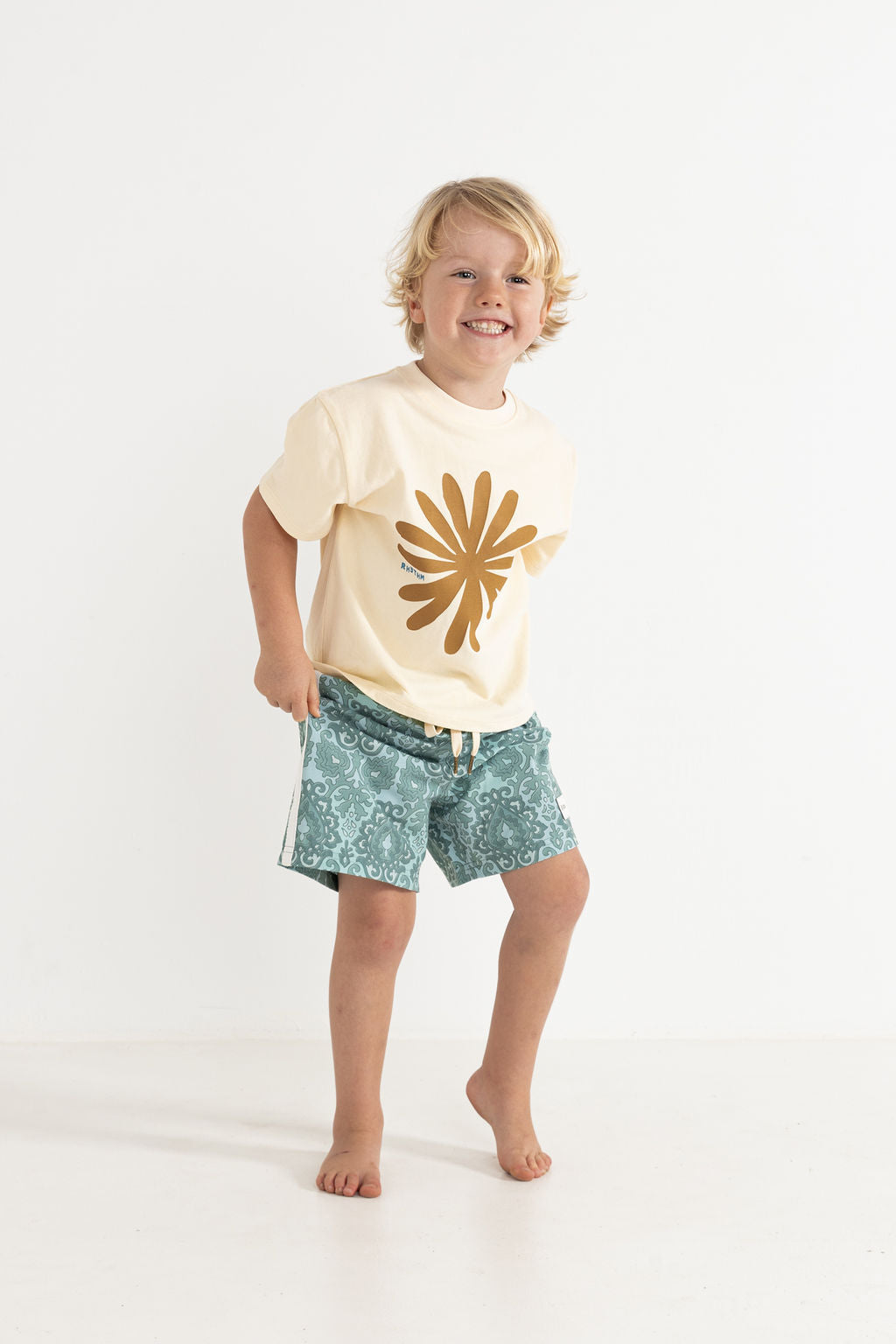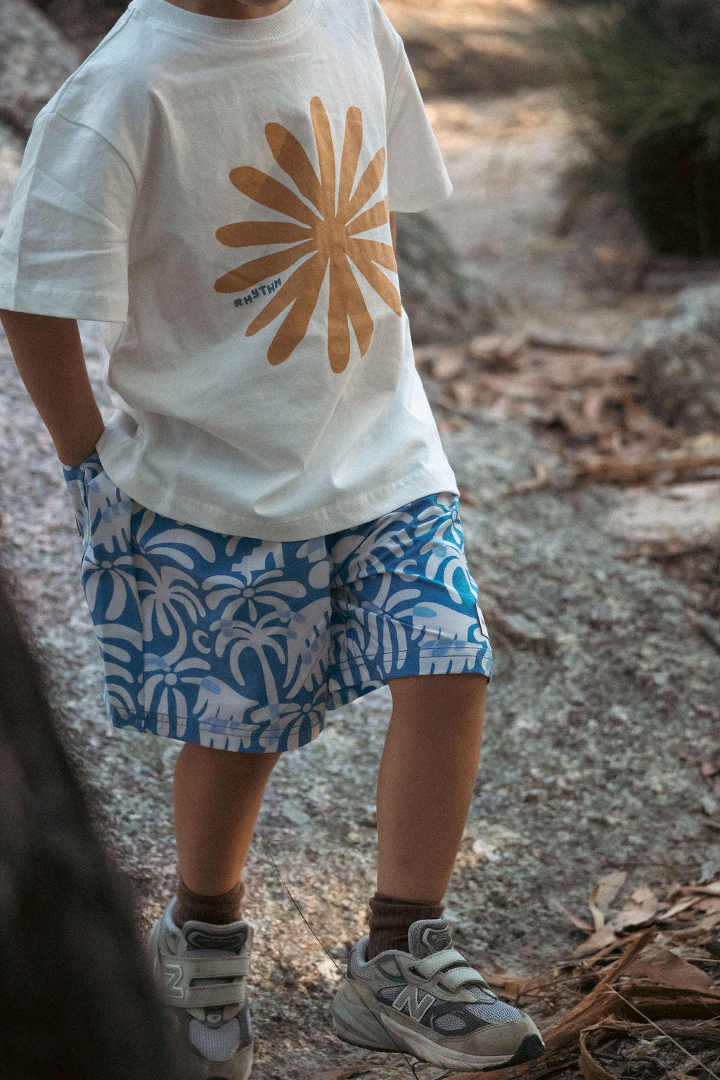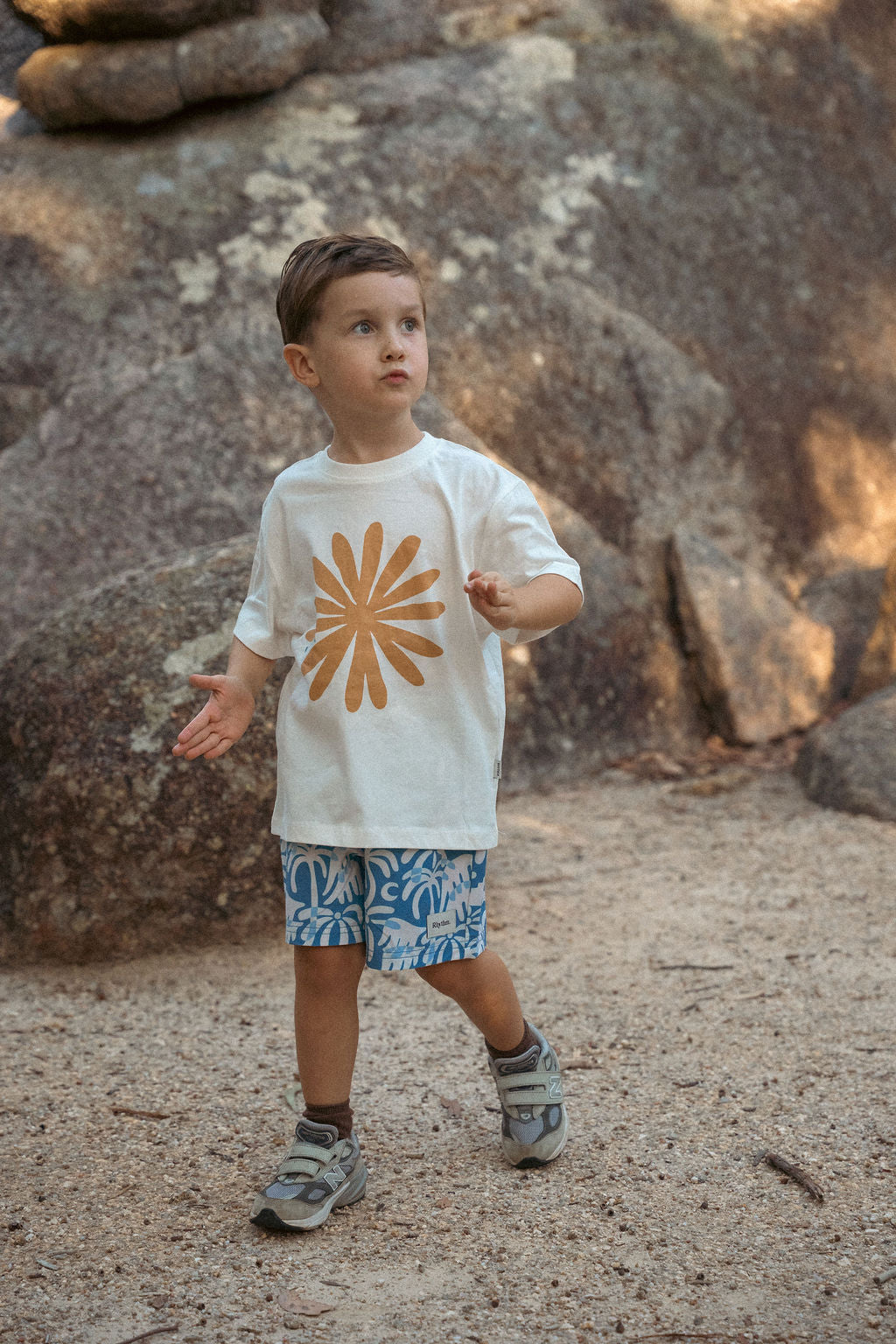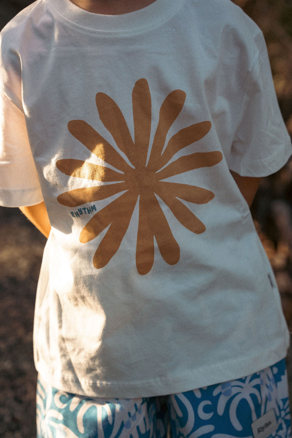 The Rhythm Kids Sun Ra T-Shirt in Natural White features a soft, 100% cotton fabric that provides superior comfort and a relaxed silhouette, ideal for your groms beach hangs, playtimes and chill.