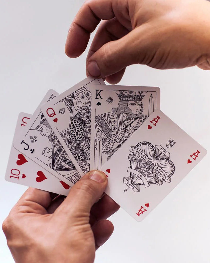 With an nod to the classic aesthetic of traditional playing cards, this deck pays tribute to the old style while adding nuance. If you look closely, there is a drama playing out throughout each court card.