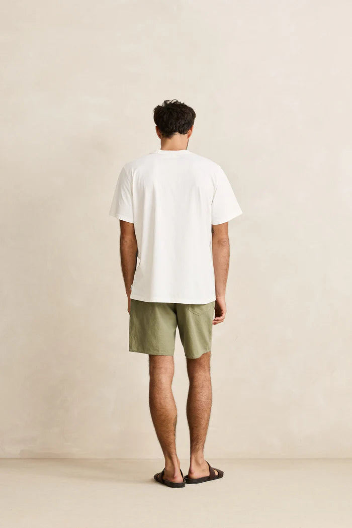 The Classic Linen Jam is a relaxed elastic waist short crafted in durable linen cotton blend mid-weight fabric, this style fits 17" above the knee and features side pockets and a back patch pocket, including an elastic waist with an adjustable drawcord, designed for everyday comfort and wear.