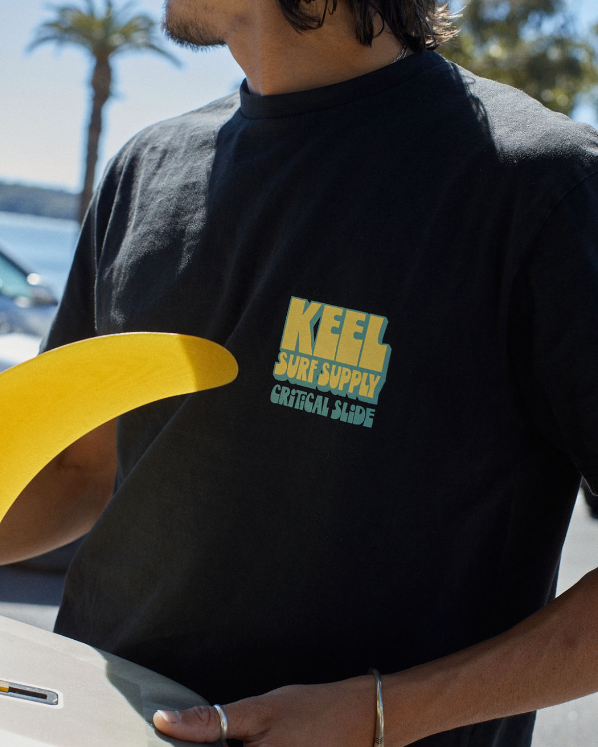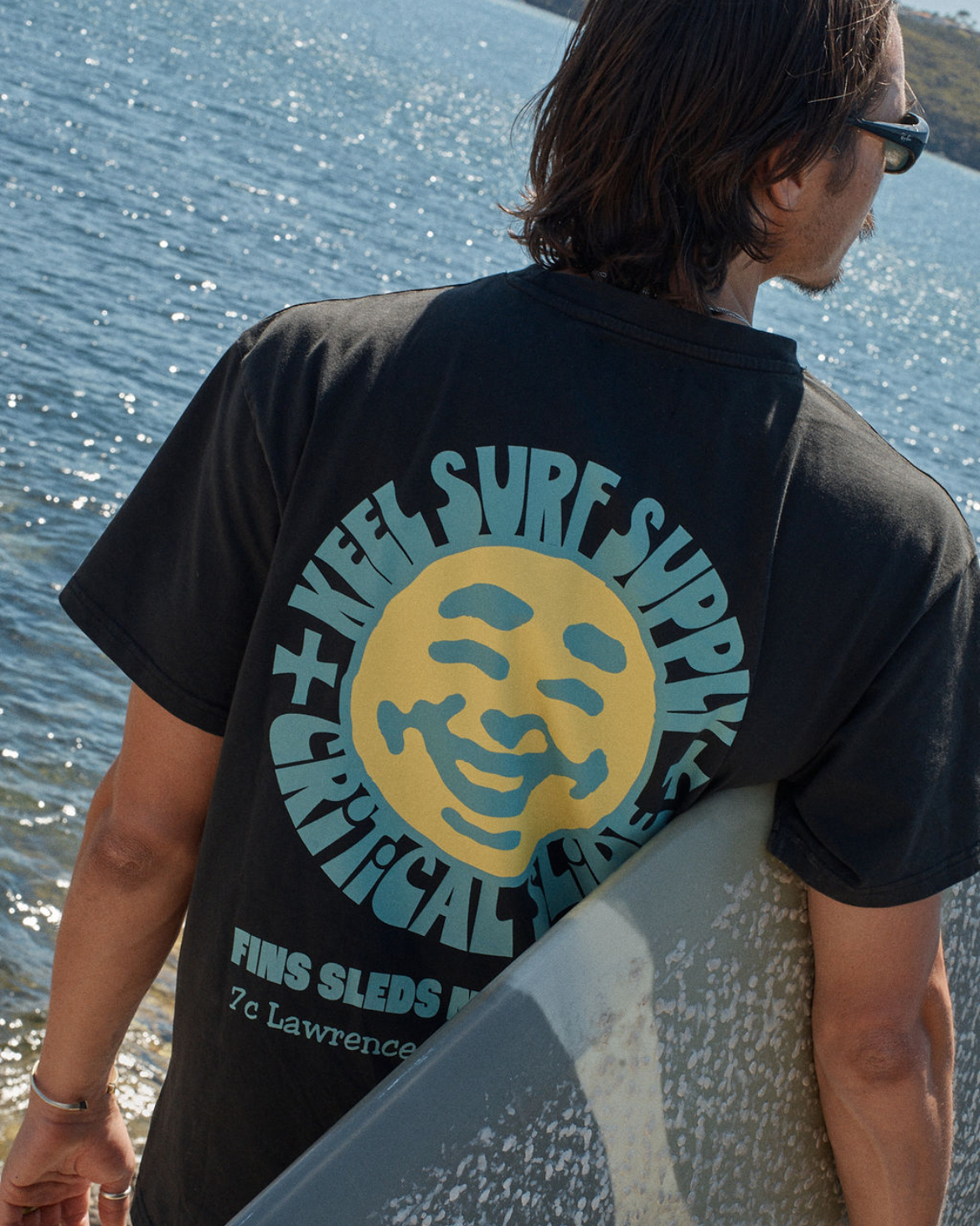 Born from a shared love of surf, art and good company, the Sleds & Threads Tee marks another fine collaboration between the (North meets East) Critical Slide and Keel Surf & Supply.